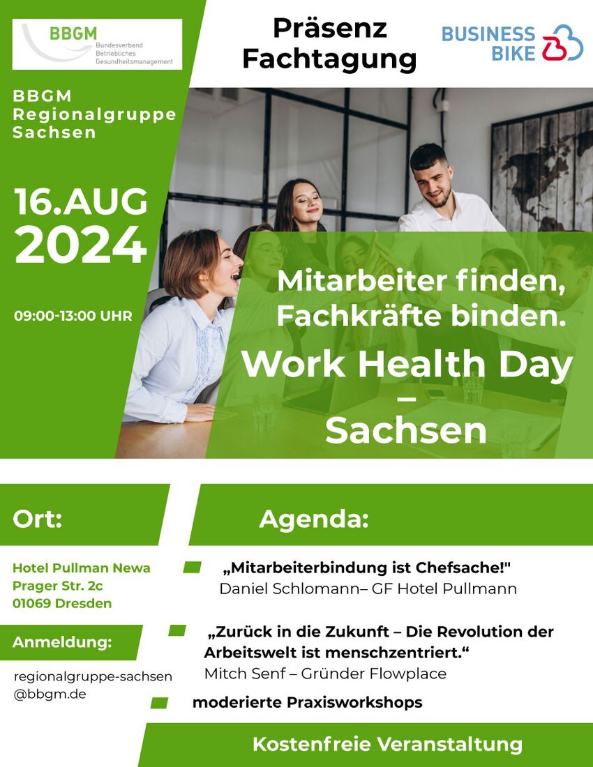 Der erste Work-Health-Day der Regionalgruppe Sachsen des Bundesverbandes Betriebliches Gesundheitsmanagement (BBGM) lädt Führungskräfte und Personalverantwortliche am 16. August 2024 ins Dresdner Pullman Hotel ein. Von 09:00 bis 13:00 Uhr werden verschiedene Impulse zum Thema der Mitarbeitendengewinnung und -bindung angeboten. Die Teilnehmenden lernen Ansätze und Strategien kennen, um ihre Belegschaft gesund und motiviert zu halten.